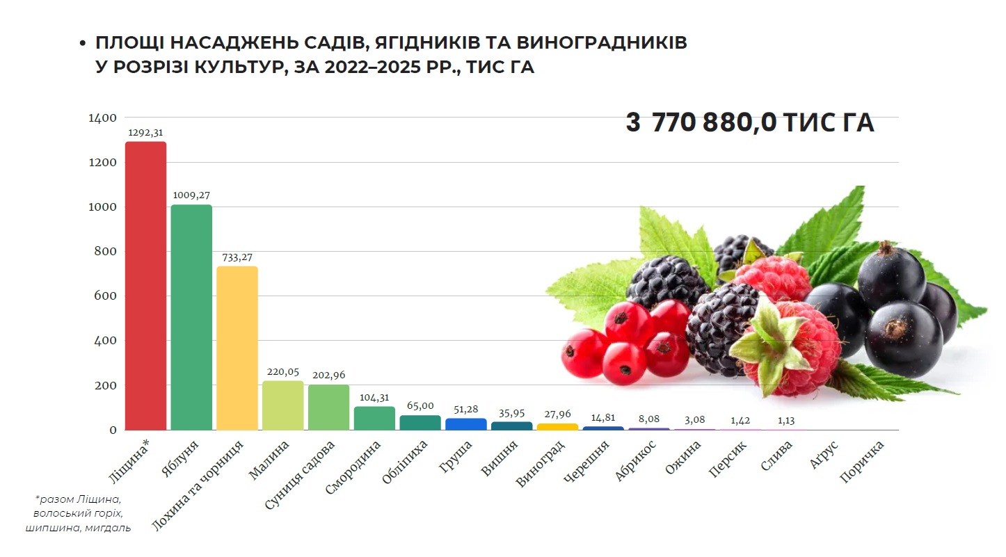 Упродовж 2022–2025 років у межах програми підтримки садівництва, ягідництва та виноградарства українські аграрії заклали 3 770,9 га нових багаторічних насаджень у 19 областях України. Про це повідомила Асоціація «Ягідництво України».