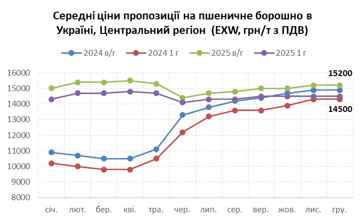 Згідно з моніторингом цін, декларована виробниками вартість борошна пшеничного з початку 2024 р. до кінця 2025 р. також зросла на 40%.