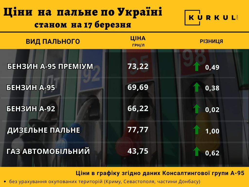 На українських АЗС продовжує дорожчати пальне. За даними консалтингової групи А-95, станом на 17 березня бензин А-95 коштує 69,69 грн/л, дизельне пальне — 77,77 грн/л, автогаз — 43,75 грн/л. Повідомляє Kurkul.com.